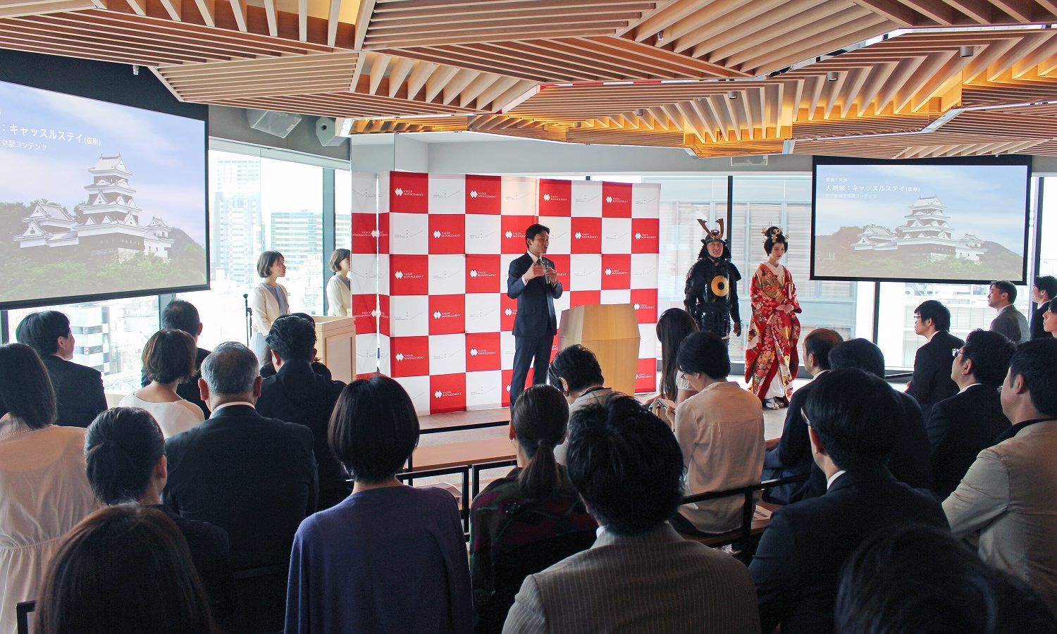 代表取締役 他力野による新ブランド設立の経緯と事業概要説明からはじまり、企画部ゼネラルマネージャー 福山による「VMG」のブランド説明、そして今後の事業展開について発表しました。今後の事業展開のお話においては、当社の新事業となる愛媛県大洲市の大洲城・宿泊型城主体験「キャッスルステイ」の“城主モデル”が会場に登場し、お客様に実際に身に着けていただく予定の大洲藩の甲冑をお披露目しました。
