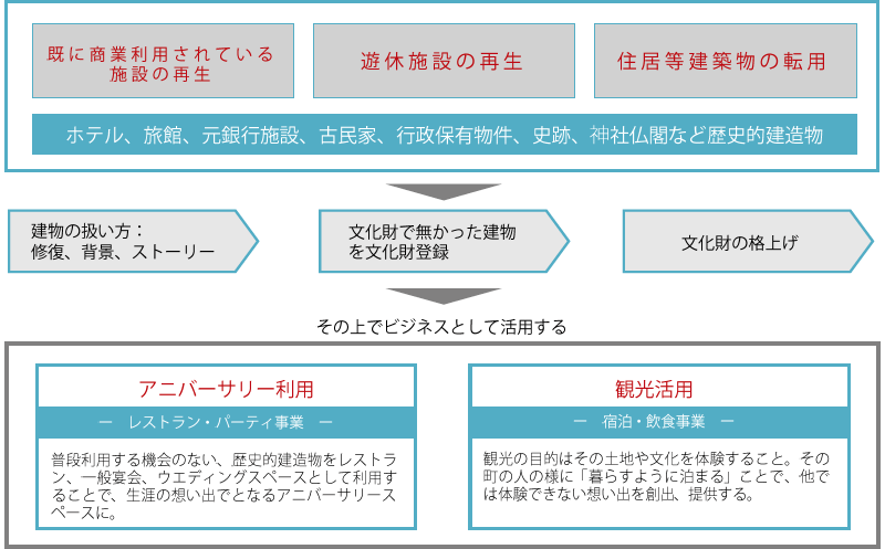 しかし、地域に眠る複数の歴史的建造物をまち単位でコンセプトを合わせ、まちづくりを行うことで単体施設では出せないまちの風情・情緒が旅のコンテンツとなり、採算性も格段に高まります。