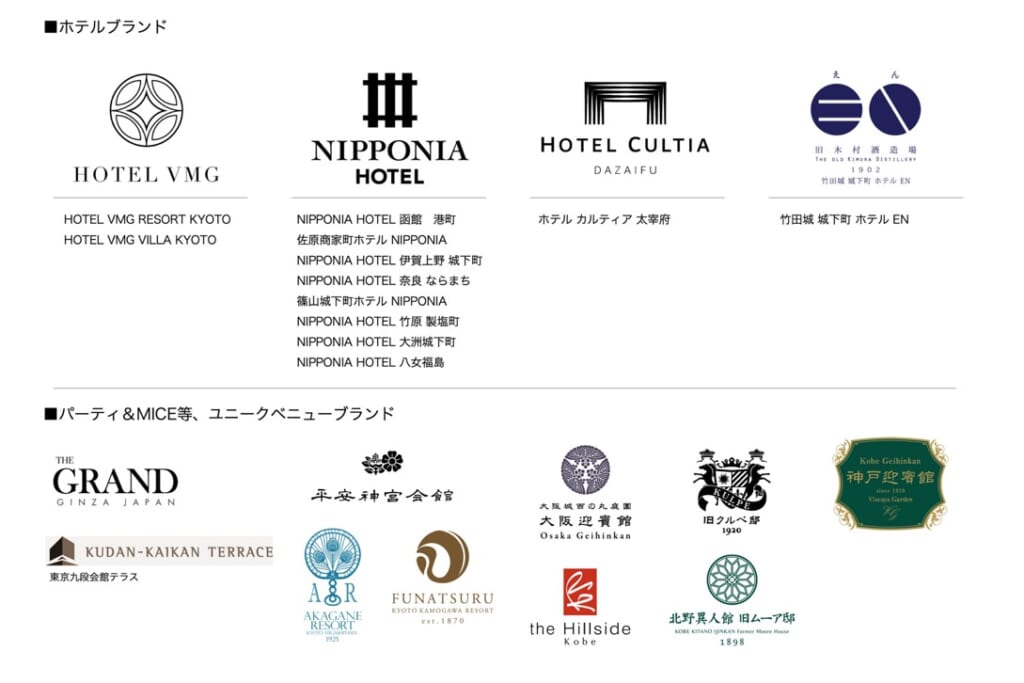 VMG HOTELS & UNIQUE VENUESは、日本全国に22施設展開するホテル・宿泊施設のブランドで、歴史的建造物や文化的に価値のある場所を活用した宿泊体験を提供することを特徴としています。VMGは、文化財級の建物や地域資源を再生・活用し、現代のニーズに合った宿泊施設として運営することで、顧客に特別な体験を提供しています。施設は、宿泊だけでなく、結婚式やイベント、MICEなどのユニークな場所としても利用されており、伝統的な日本文化やその地域の魅力を存分に感じられる環境が整えられています。VMGの施設は、施設ごとにその土地の歴史や文化を反映した体験をできることが魅力です。また、すべての施設でお客様に対応するスタッフは「VMGコンシェルジュ」として、お客様に土地の魅力をお愉しみいただきながら、個別のおもてなしご提案をさせていただきます。