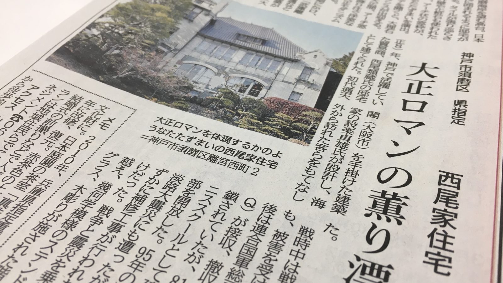 2018.03.09 【新聞】「神戸新聞」に神戸迎賓館 旧西尾邸が取り上げられました。 「わが町の文化財」として紹介いただいています。 掲載内容はこちら 神戸新聞 神戸版 2018年3月9日号 神戸新聞とは 本社が兵庫県神戸市中央区に所在する神戸新聞社が発行する新聞です。 https://www.kobe-np.co.jp/