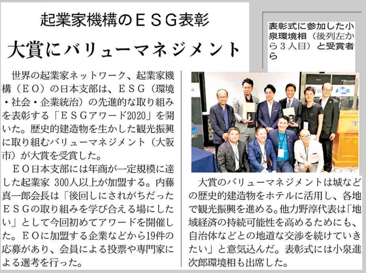 2020.09.28 【新聞】「日経産業新聞」にバリューマネジメントが取り上げられました。 「起業家機構のESG表彰、大賞にバリューマネジメント」として紹介いただいています。 日経産業新聞 2020 年9月28日(月曜日) 「日経産業新聞」とは 日本経済新聞社が発行している、産業・企業情報に特化したビジネス総合紙です。 https://www.nikkei.com/theme/?dw=18083101