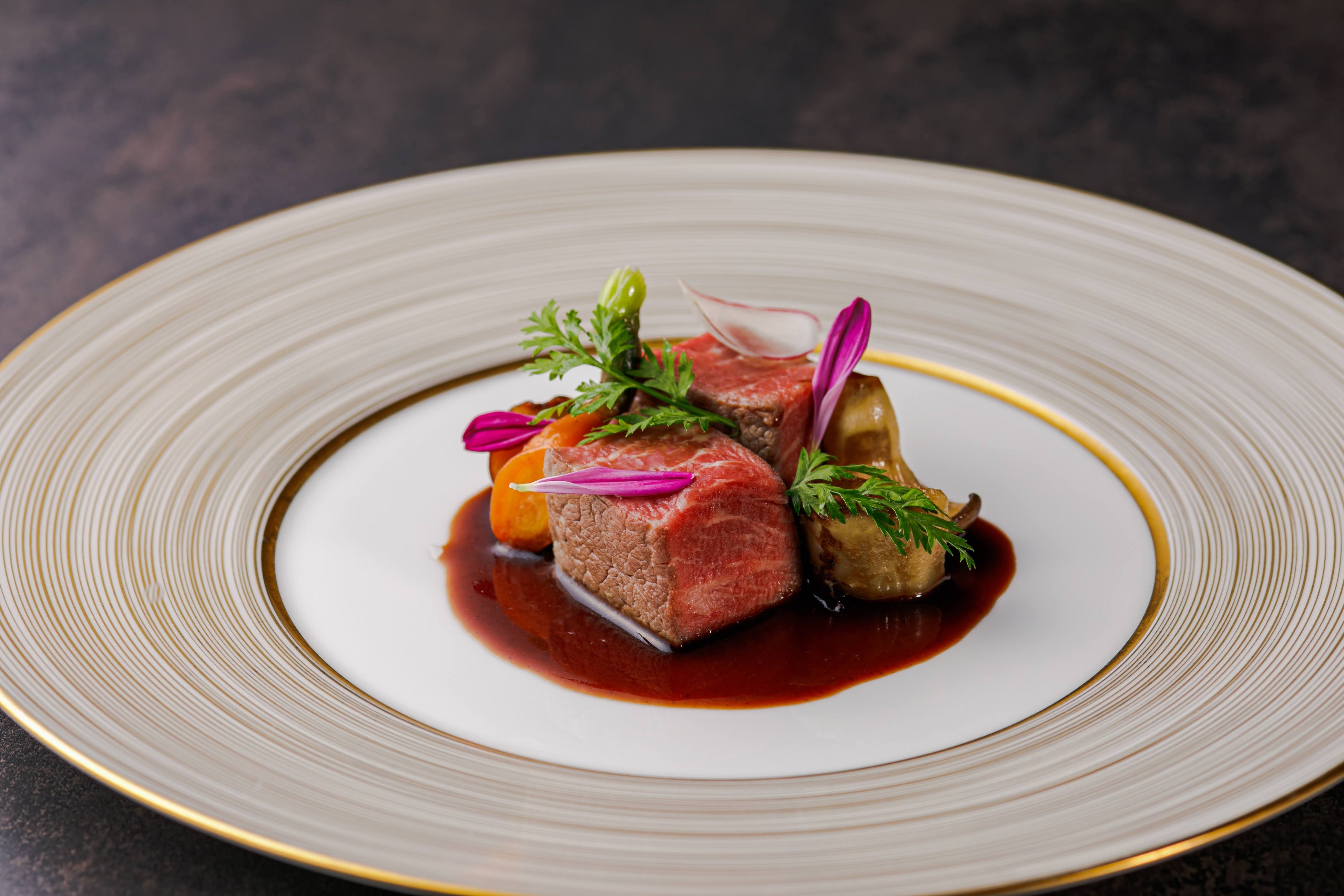 メイン料理はお二人の幸せを願い、千葉のブランド牛「しあわせ絆牛」を使ったお料理をご用意。「信頼の絆」「環境の絆」「家族の絆」を大切にするという想いから名づけられたこのお肉は、程よい霜降りと柔らかな赤身肉の食感が特長です。さっぱりとした食感をお愉しみください。