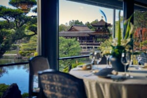 翌朝のご朝食は、平安神宮の境内にある平安神宮会館にてご用意いたします。1万坪を誇る名勝「神苑」に隣接し、窓から美しい日本庭園の景観を望むロケーションを愉しんでいただけます。