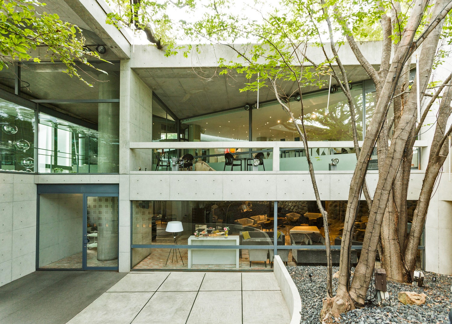 巨大なコンクリートの壁や一面をガラスに覆われたシンプルで無機質な外観の印象と、光と緑を携えた贅沢で開放的な空間が見事に調和し、ユニークな美意識を宿したミニマルなデザイナーズ建築はまさにモダンミュージアムのよう。