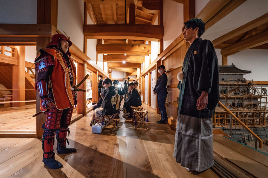何が待つのか知らされていないまま大洲城の天守へ到着したゲストをお出迎えしたのは、甲冑姿に扮した家臣団たち。御長柄隊、雅楽の演奏者らも控える中、城代家老役の声が響きました。