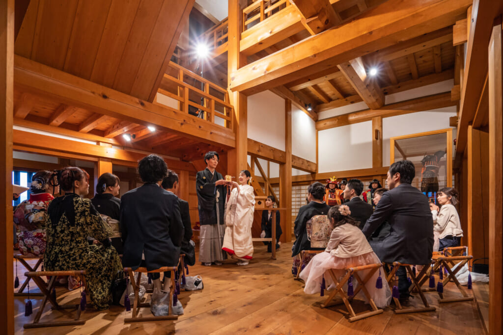 三々九度の「誓杯の儀」を執り行い、式は静かにクライマックスへ。毛筆で認められた誓の言葉をお二人揃って読み上げ、その後ゆっくりと折り畳み、印籠に入れて水引を結ぶと、大洲城で晴れて結ばれたお二人にゲストからは盛大な拍手が沸き起こりました。