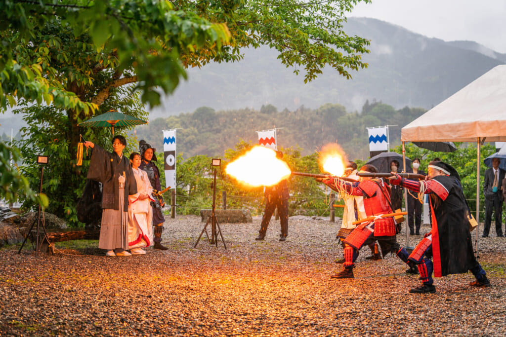 そうしてゲストと新郎新婦は、大洲藩鉄砲隊の待つ城外へ。