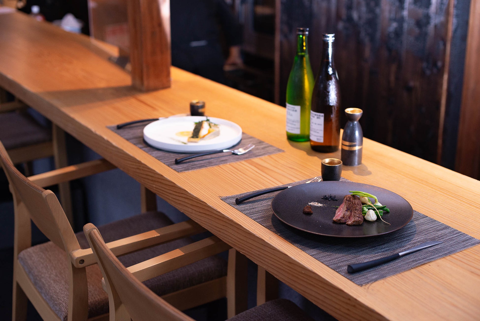 シェフとの距離が近いカウンター10席、テーブル4席の小さなダイニングです。「大和野菜」など、地元の旬の食材を使用し、フレンチの技法を用い、奈良豊澤酒造のお酒が活きるお料理をお愉しみいただけます。お客様のお好みに合わせてご提案する、季節限定・当館限定蔵出しの日本酒を織り込んだペアリング4グラス付です。