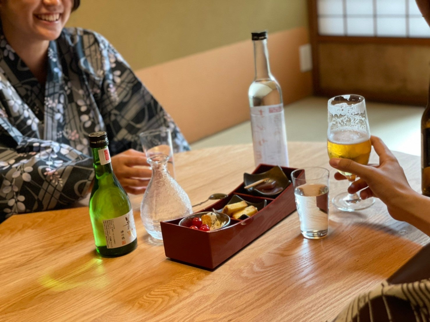日本酒はもちろんワイン・ビールなどドリンク各種と、こだわりの食材をお酒と合うようにアレンジした特別なおつまみセットをお部屋にご用意いたします。