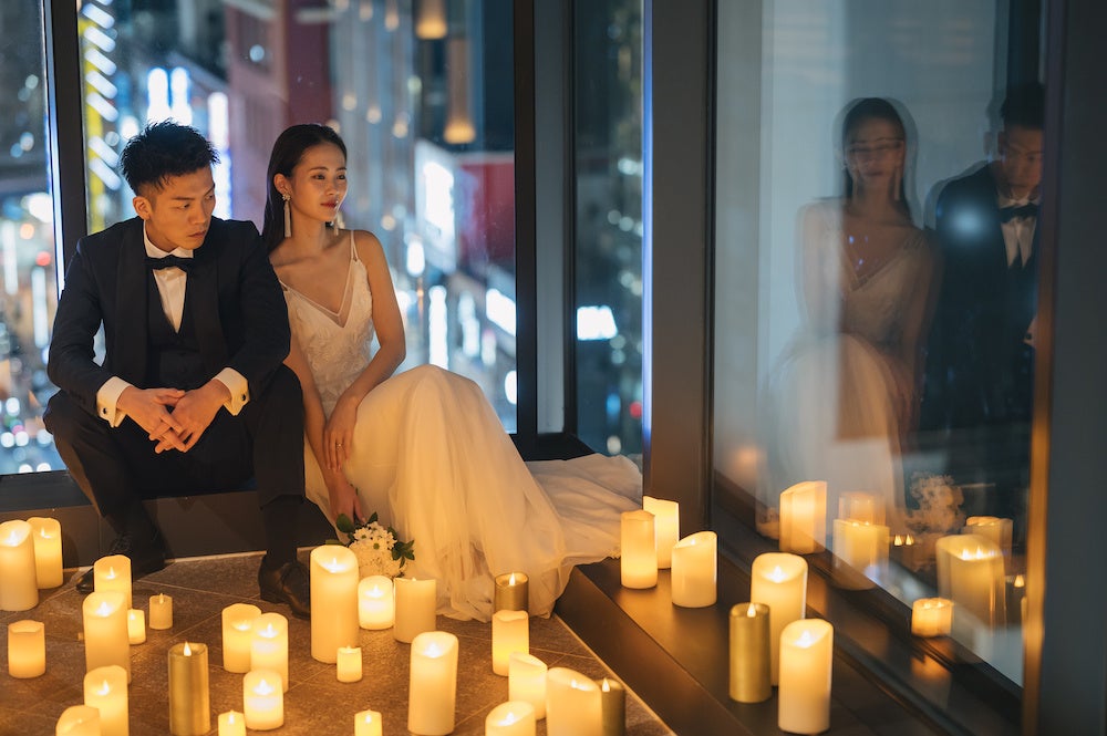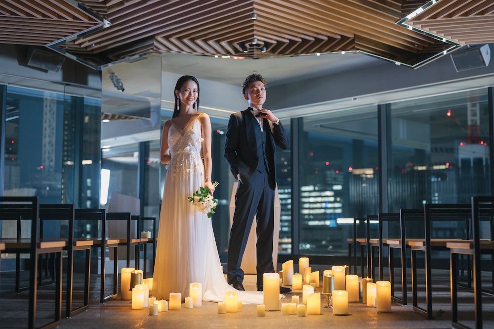 新郎新婦の写真撮影では、ガラス張りの前で夜景をバックにした写真やキャンドルを前にした写真などさまざまなシチュエーションで撮影いただけます。キャンドルを置くとガラスに明かりが反射され、幻想的な空間に包まれます。