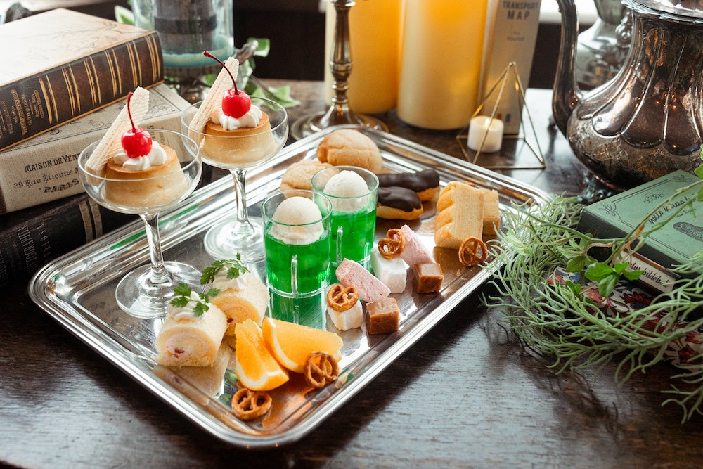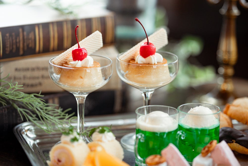 今回は3種のお食事とスイーツをご用意。和風キッシュやグラタン、そして洋食の代名詞でありシェフこだわりのハヤシライスをミニサイズで提供いたします。どこか懐かしいシルバーのトレイには、固めのプリン、クリームソーダのゼリーなど、その時代にインスピレーションを受けたスイーツをラインナップしています。