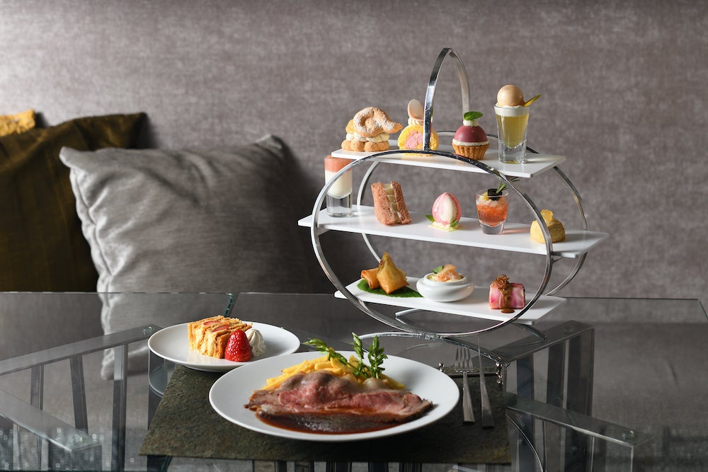 桃の形がキュートなマカロンには烏龍茶のクリーム、そしてジャスミンのジュレや赤桃のソースの杏仁豆腐など、見た目だけでなく味わいや香りで、オリエンタルな世界観を表現しています。12種のセイボリーとスイーツに加え、名物の苺のミルフィーユも味わえる、大満足のセットです。