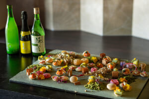 ご宴席の始まりのアペリティフタイムには、シェフオリジナルの八つ橋を用いた一品や、季節を感じるもなか等、京都の風情を感じられるおもてなしの軽食をご用意します。京都の老舗酒蔵が厳選した日本酒とのペアリングとともに、五感でも伝統美を感じていただける、当館オリジナルのアペリティフをお愉しみください。