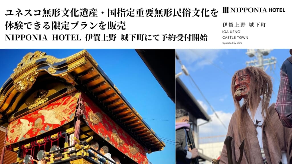 バリューマネジメント株式会社(本社:大阪府大阪市、代表:他力野 淳、以下、当社)が展開するグループブランド「VMG HOTELS & UNIQUE VENUES」は、当社が運営する「NIPPONIA HOTEL 伊賀上野 城下町」(三重県伊賀市、以下、当ホテル)にて、2025年10月17日(金)~10月19日(日)に開催される「上野天神祭」を間近で体験できる宿泊プランおよびディナープランを販売いたします。