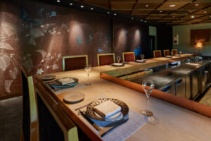 「高台寺 極 -KIWAMI-」は、「アカガネリゾート京都東山1925」の奥にある、10席限定のプライベート空間です。京都の着物デザイナーでありアーティストのJotaro Saitoによる西陣織が壁面や椅子の背面に施され、ラグジュアリーな空間を演出します。「ダイナースクラブ フランス レストランウィーク2025」開催期間中は、本イベント専用のコースメニューを能村仁絵が提供いたします。カウンター越しにシェフが料理を提供するので、シェフとのコミュニケーションが楽しめるのも、高台寺 極 -KIWAMI-の魅力の一つです。