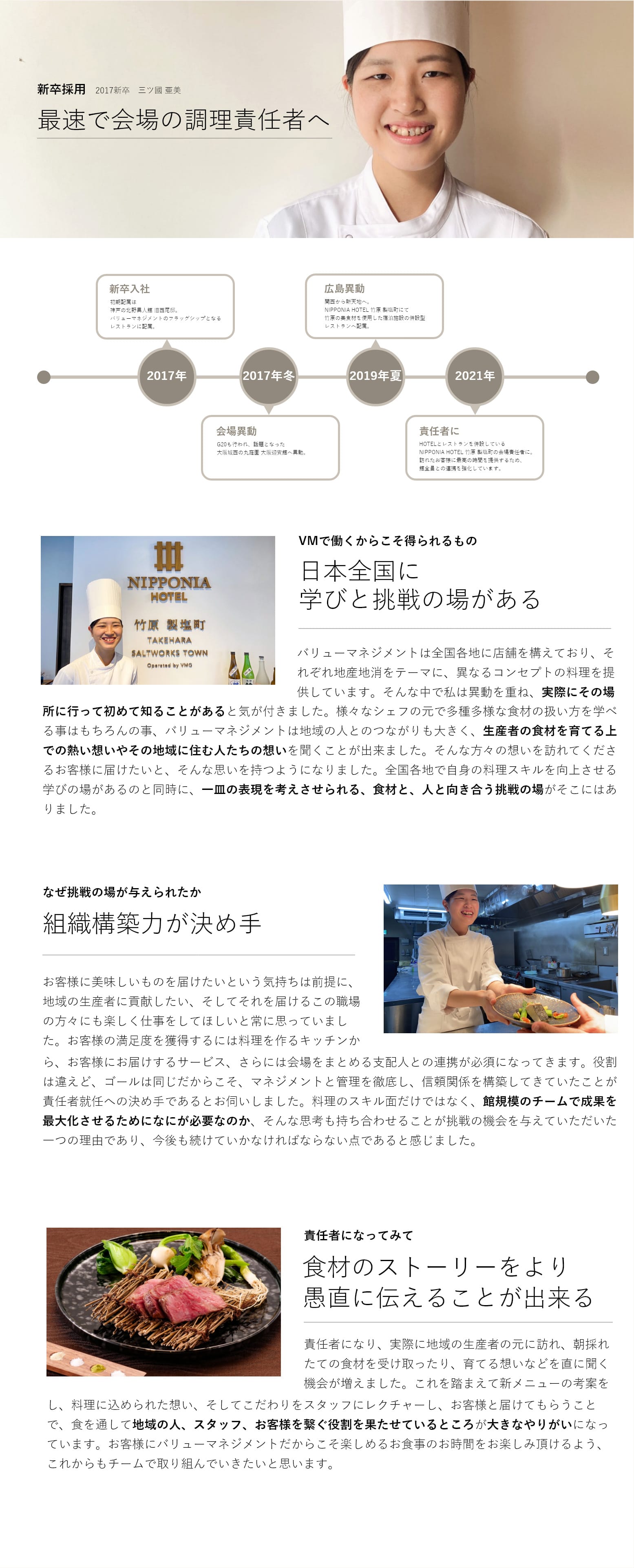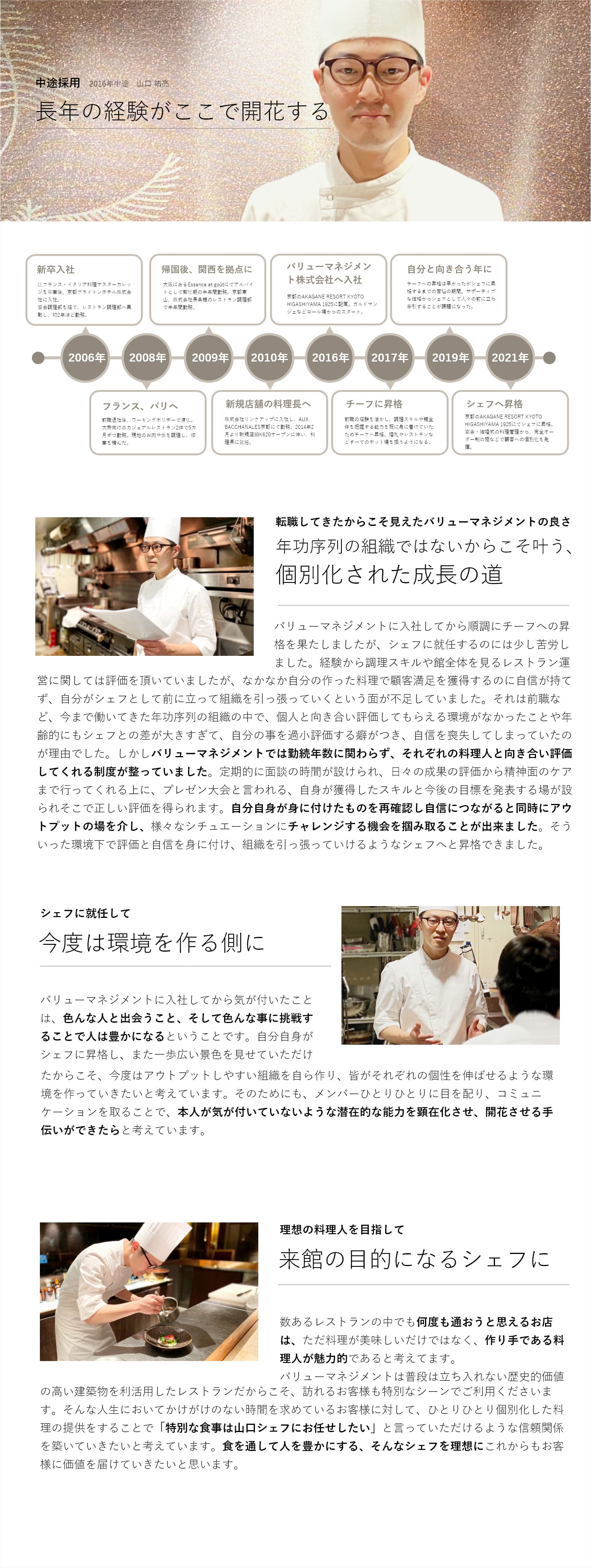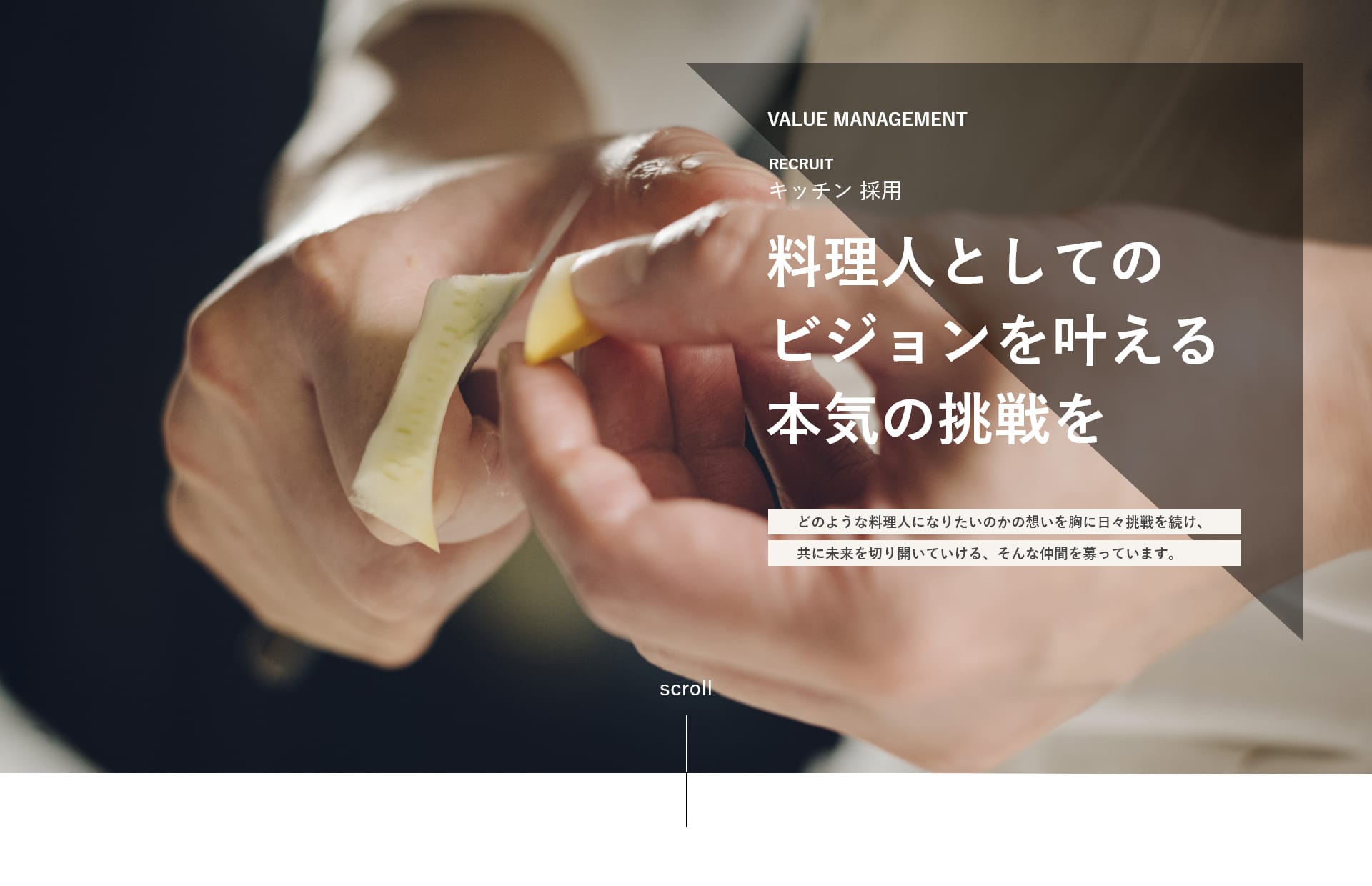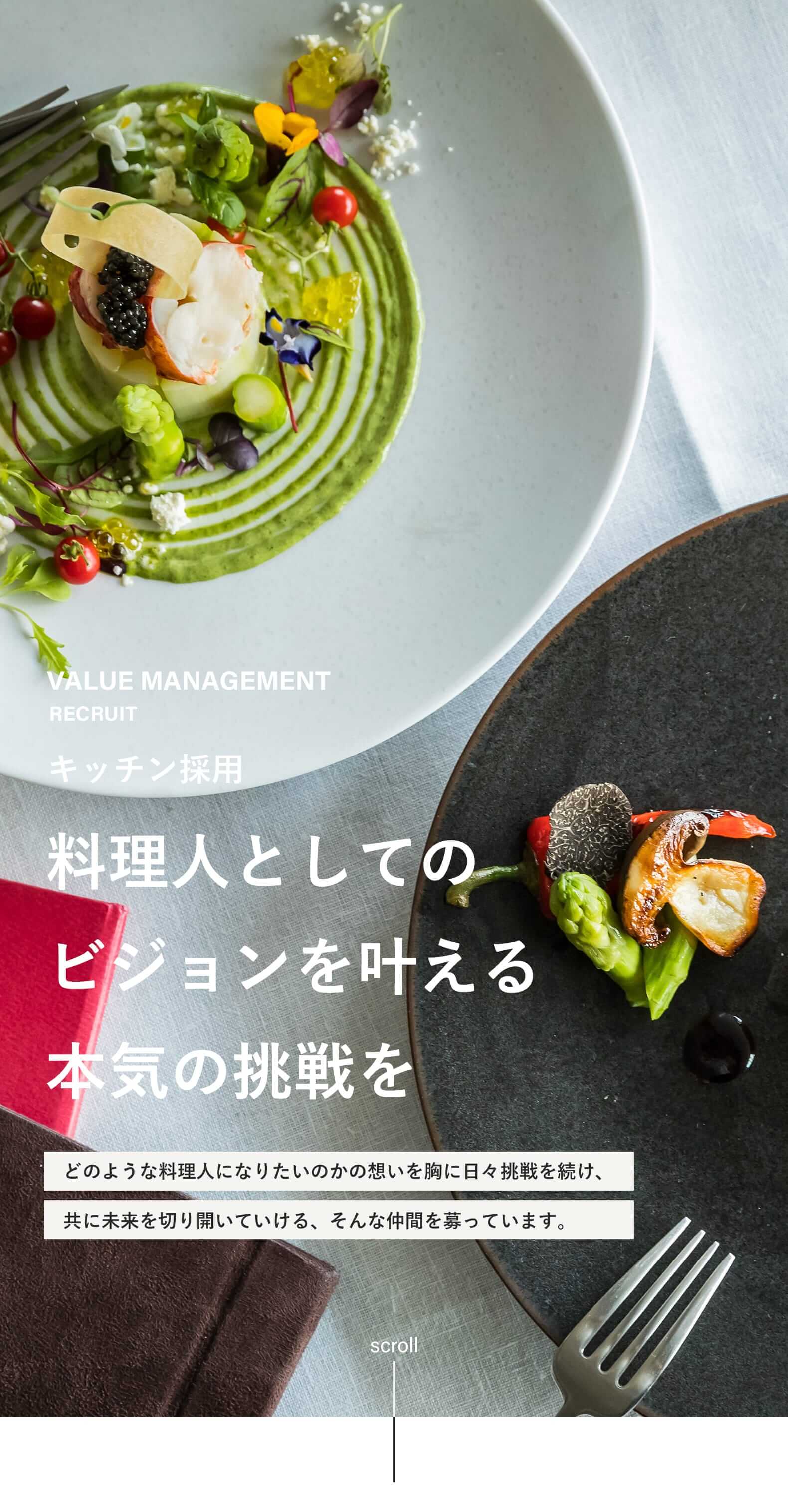 料理業界では次のステップに上がるのが時間にかかることが現状です。しかしバリューマネジメントでは高みを目指す方々にステップアップの機会が与えられ、それにこたえられる人たちはどんどん上に上がっていく、そんなチャレンジングな環境が整っています