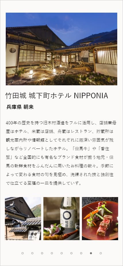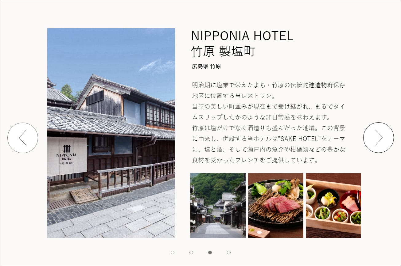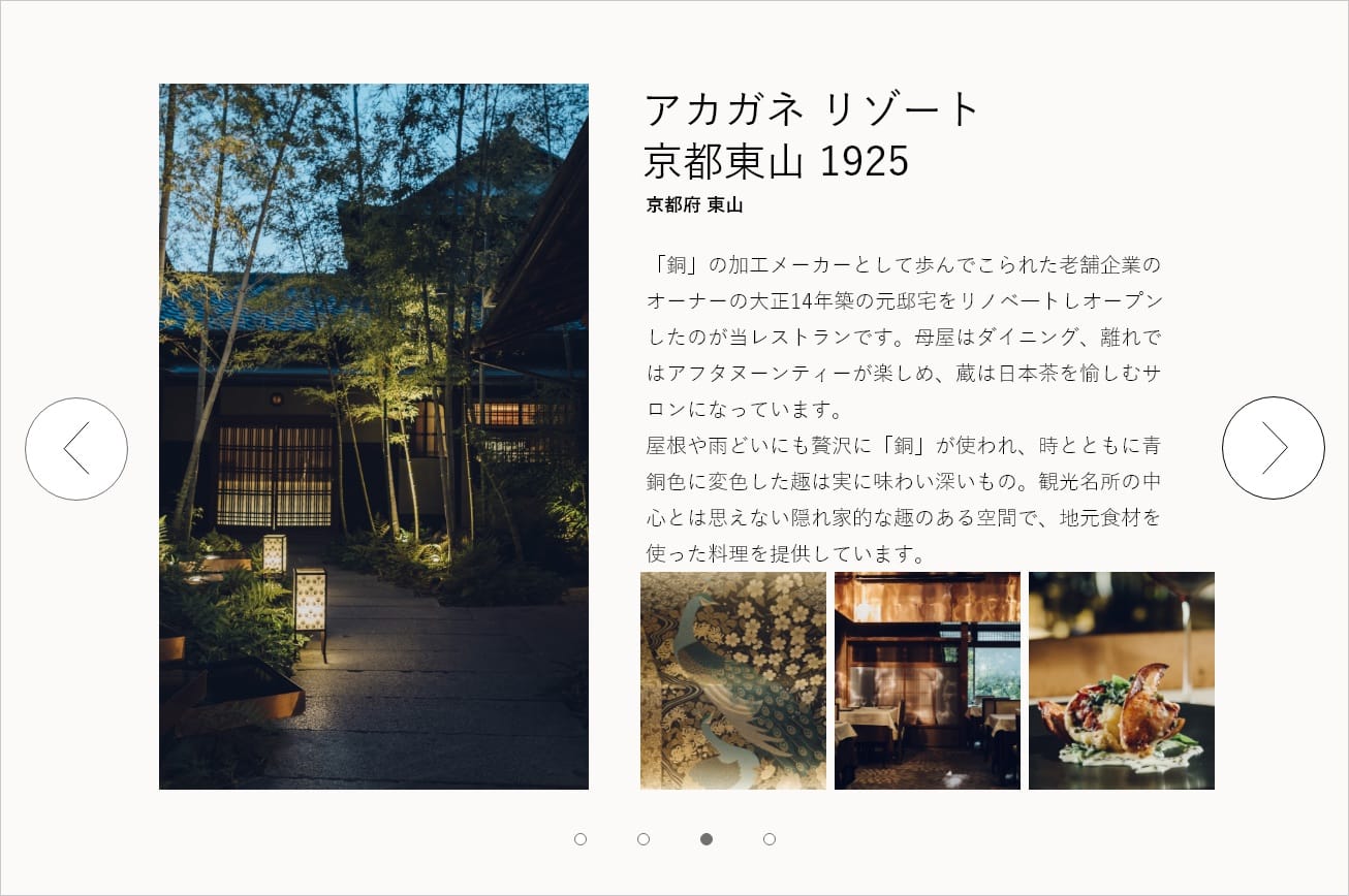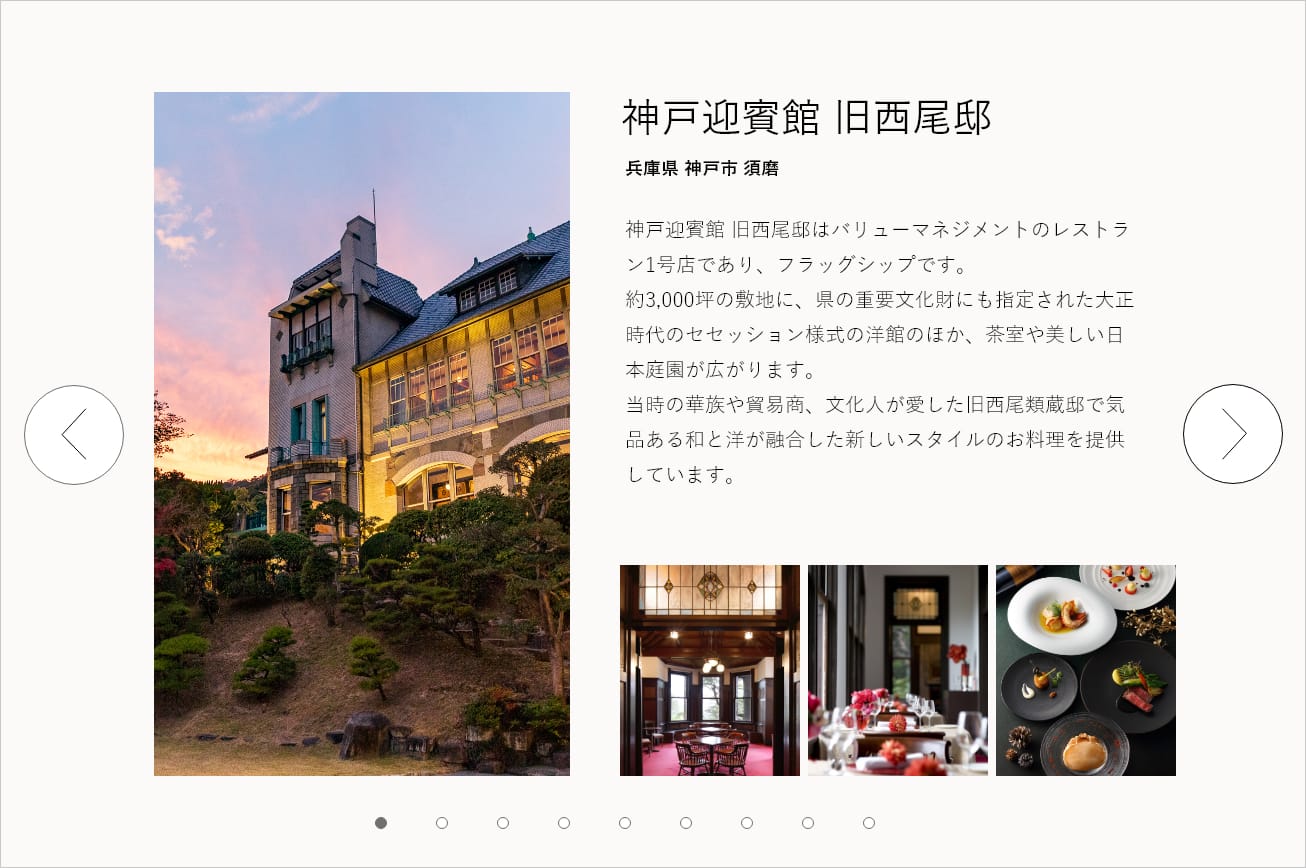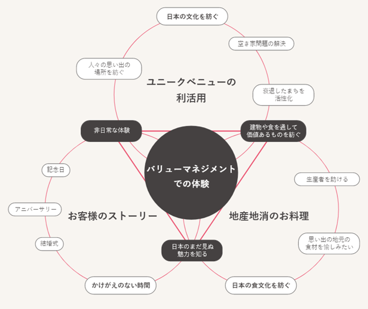 VMG HOTELS & UNIQUE VENUESは「日本文化を紡ぐ」ことを理念に、歴史的価値の高い建造物を利活用しています。そんな日本の文化が色濃く残った価値ある建造物の中で、地産地消のお料理を振舞うことで、お客様にここでしか体験できない“かけがえのない時間”を提供しています。そうして人々に必要とされることによって日本の価値ある建造物、食文化の魅力が紡がれ、日本を活性化へ貢献するという大きな取り組みにも携われています。